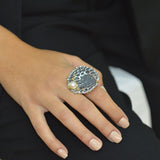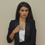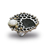 Craft: The surface is darkly textured, emphasizing the upper cutout in a white rhodium-plated silver layer.