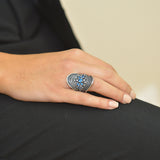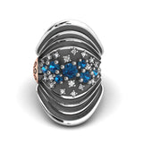 Craft: The surface is darkly textured, with white wavy relief. Inlaid with dark blue topaz and synthetic white sapphire.